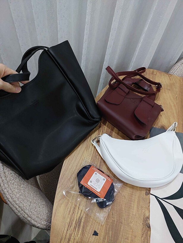Şık ve fonksiyonel 3'lü Çanta Seti (Siyah, Beyaz, Bordo), suni deri ve tek bölmeli tasarımıyla günlük kullanım için idealdir. Setteki çantalar hem el, kol hem de omuz çantası olarak kullanılabilir ve her kombine uyum sağlar.