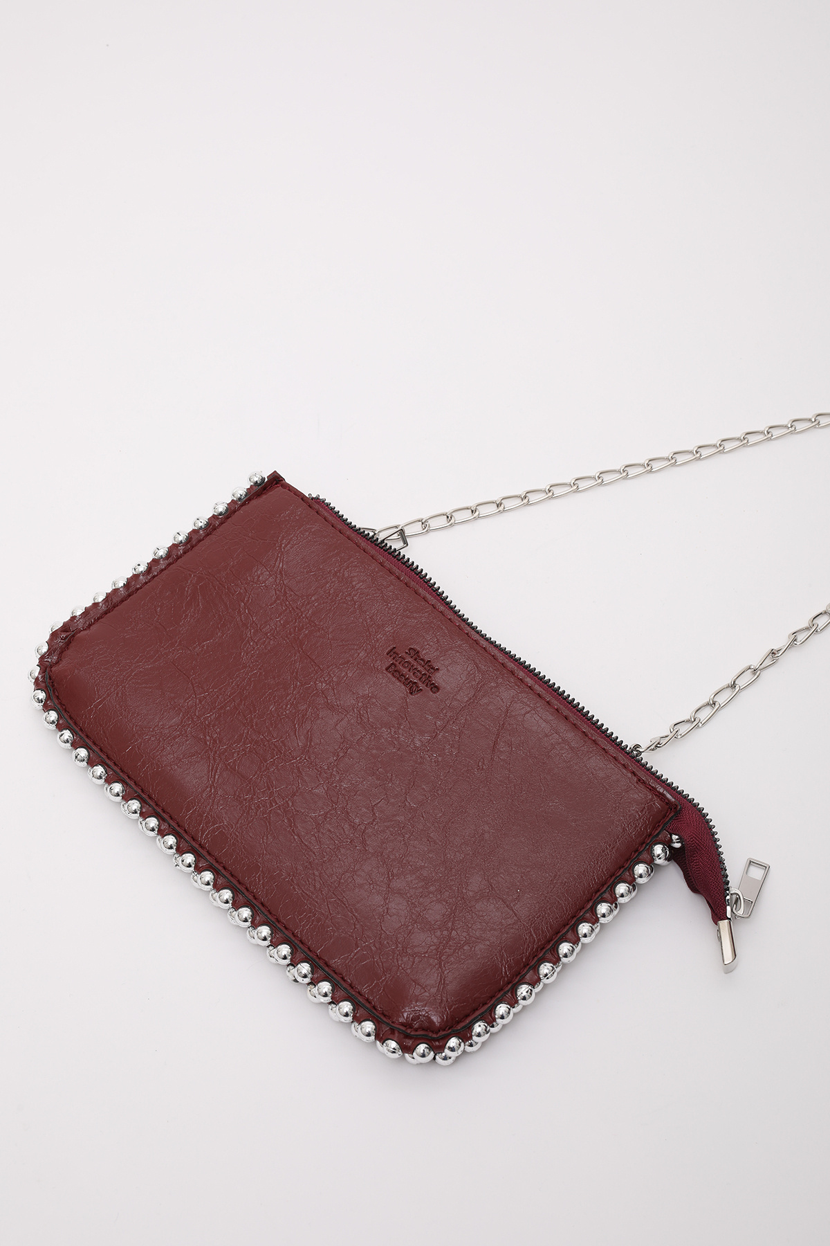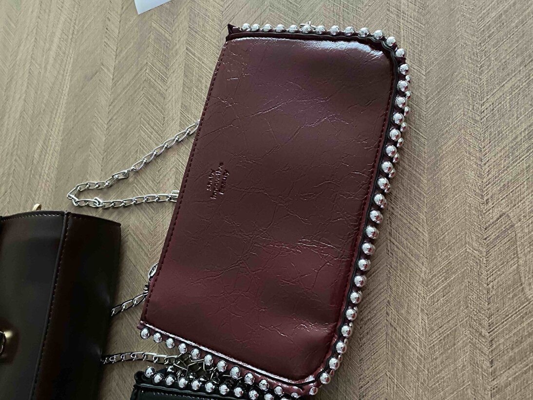 Bordo Kadın Omuz Çantası | Suni Deri | 3 Bölmeli | Boncuk Detaylı | Fermuarlı | Zincir Askılı | El, Kol ve Omuz Çantası