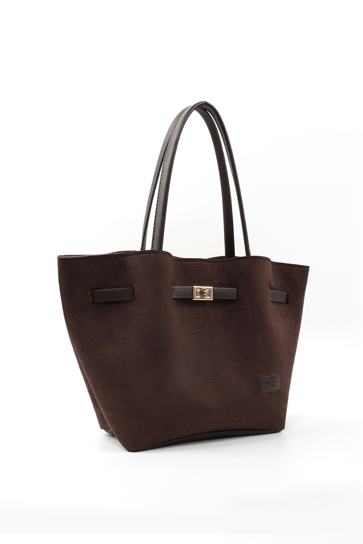 Kahverengi Süet Omuz Çantası | Suni Deri | Astarlı | Çıtçıtlı | Kilit Detaylı | Kadın El, Kol ve Omuz Çantası