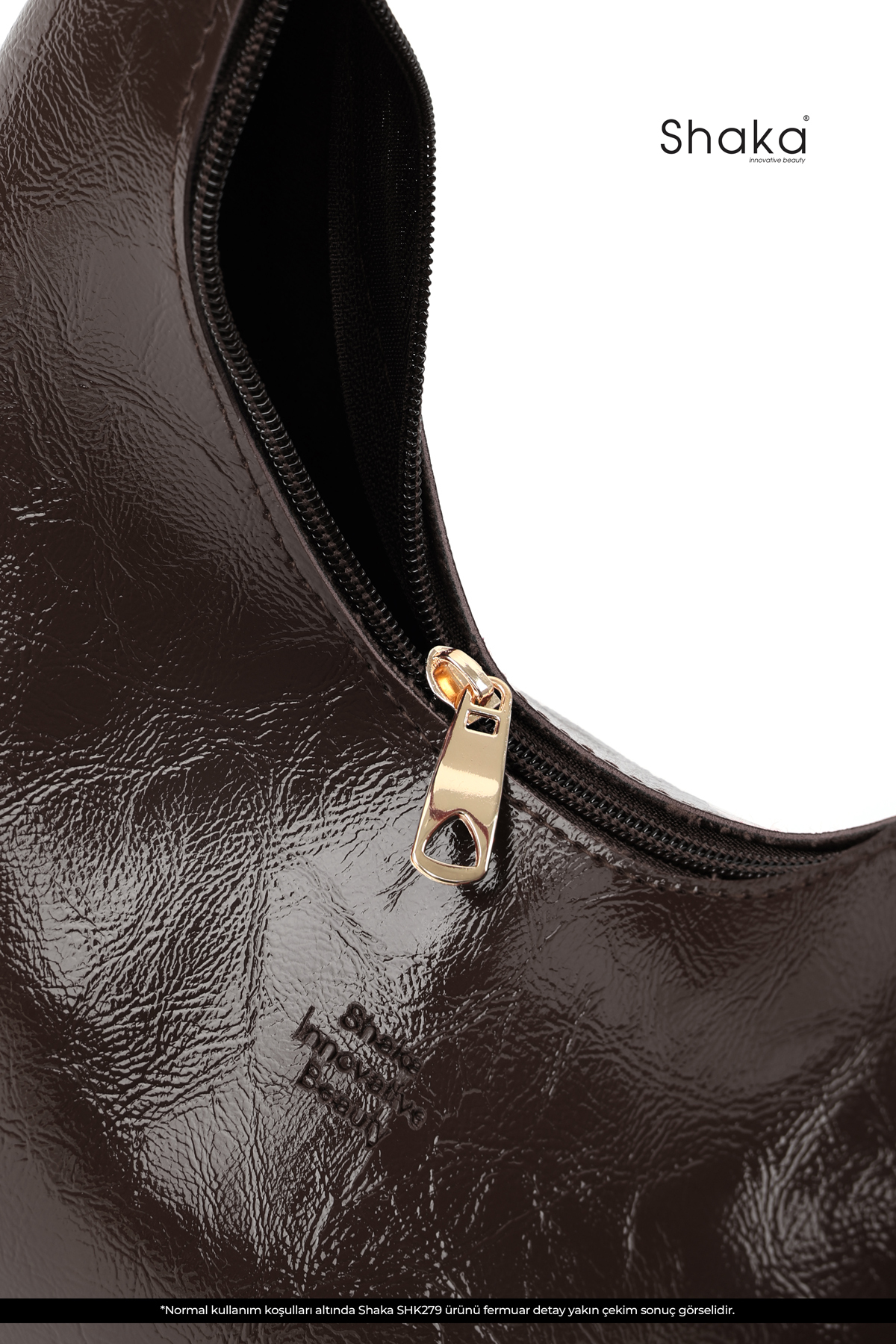 Kırışık Dokulu Kahverengi Kadın Omuz Çantası | Fermuarlı | Tek Bölmeli | Kırışık Dokulu | El, Kol ve Omuz Çantası