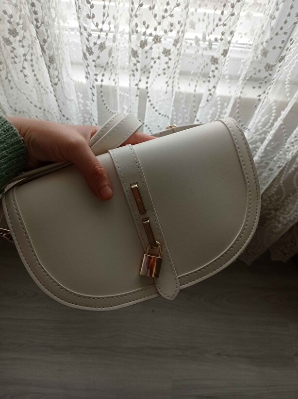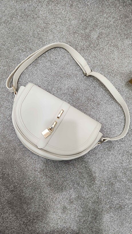 Kilit Detaylı Kadın Omuz Çantası | Krem Omuz Çantası | Suni Deri | Tek Bölmeli | Çıtçıtlı | El, Kol ve Omuz Çantası