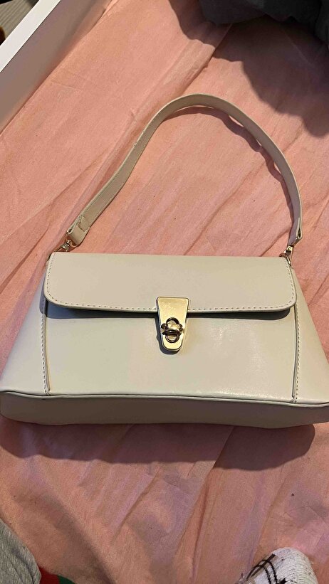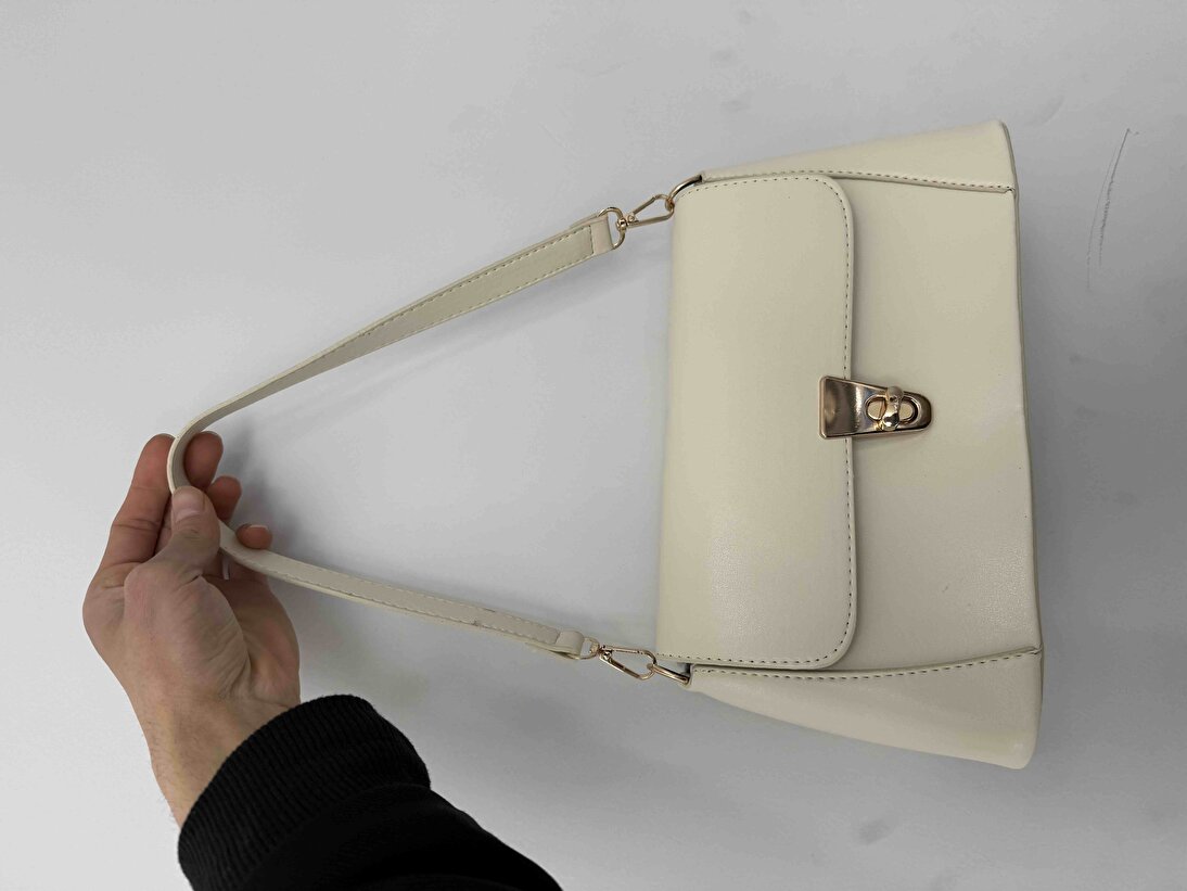 Krem Omuz Çantası | Suni Deri | Kilit Detaylı | Standart Askılı | Tek Bölmeli | Kadın El, Kol ve Omuz Çantası