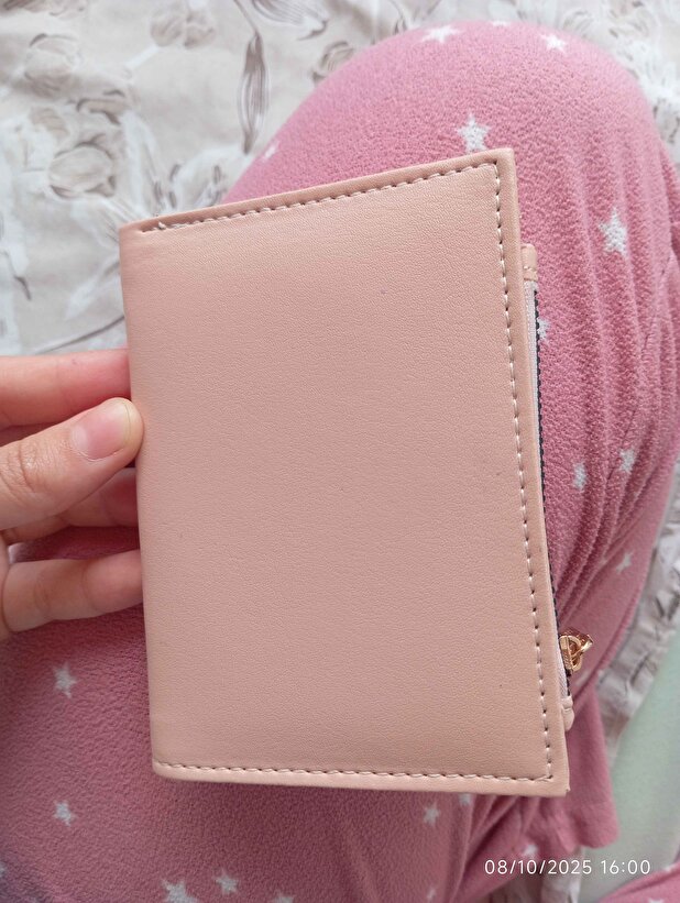 Cüzdan, dayanıklı suni deri malzemeden üretilmiştir. Pudra rengi, modern ve zarif bir görünüm sunar.