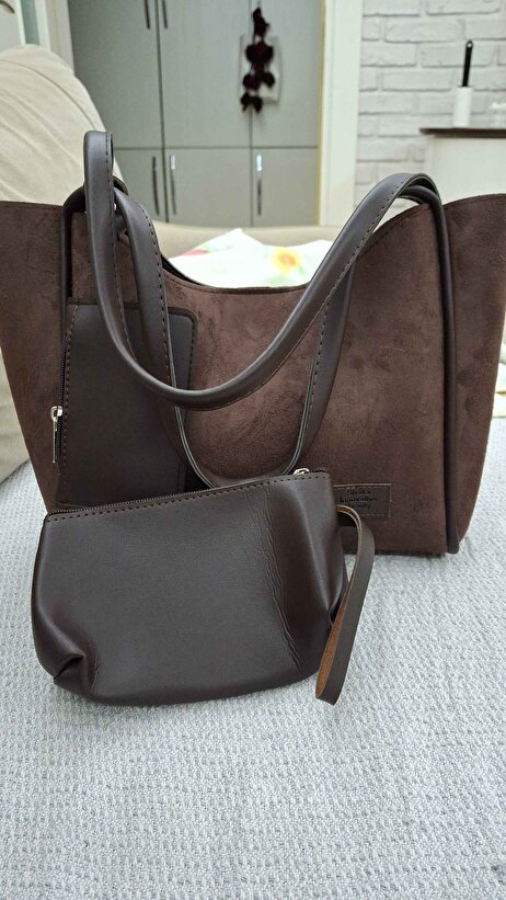 Süet Kahverengi Süet Kumaş, Çıtçıtlı, Cüzdanlı, Makyaj Çantalı Kadın El ve Omuz Çantası